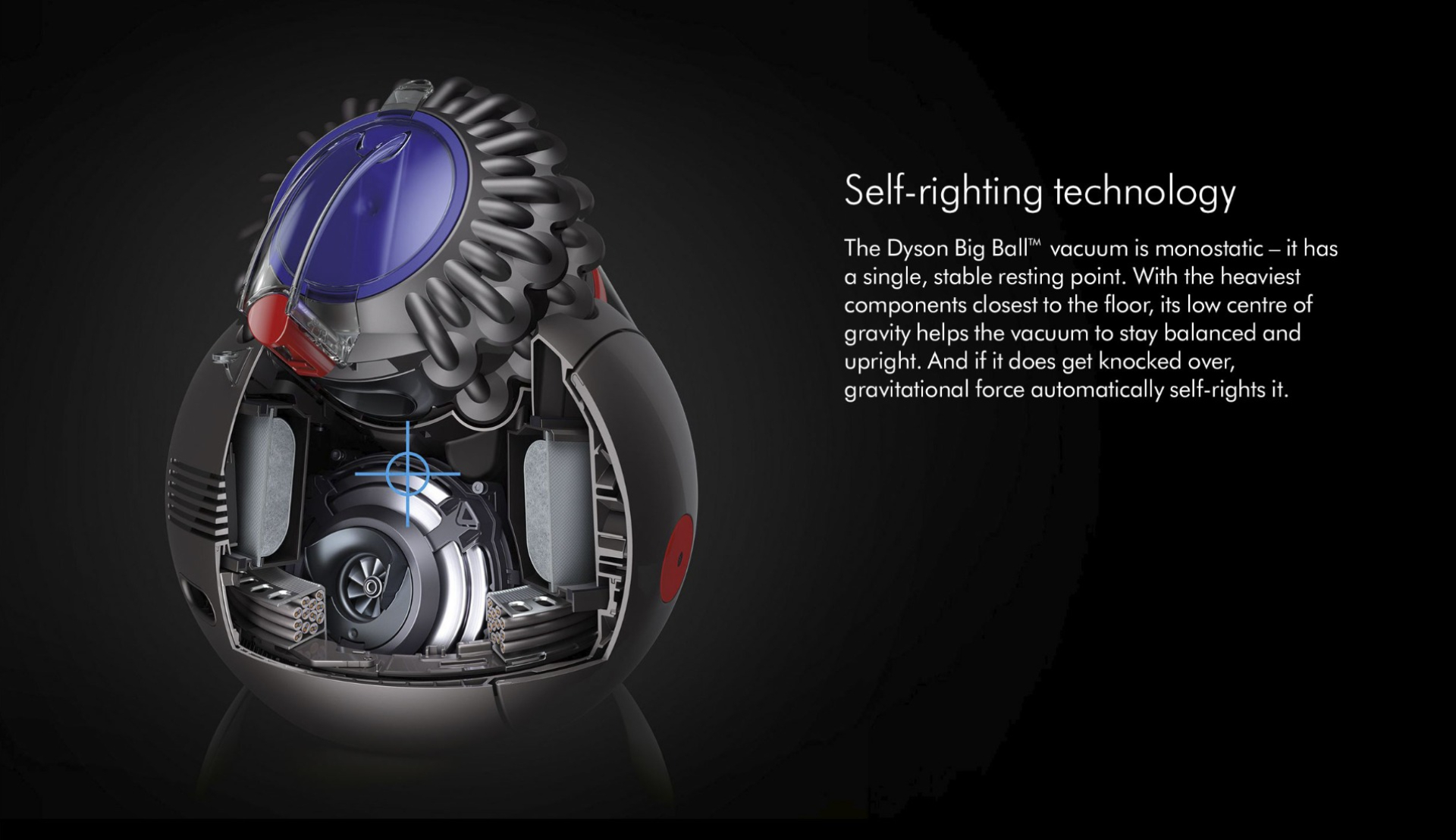 Dyson DesignThe wand handle rotates in three directions, which allows for a 360° articulation for full control. With it's low centre of gravity in the ball, it almost instantly self-rights allowing you to carry on vacuuming with no interruption.